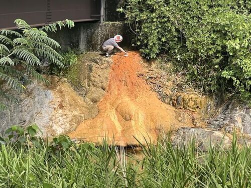 島根県アルファベット鉱泉シリーズ。 三つ目はT鉱泉。 下の写真のどこに湧いてるのでしょーか? 奥の擁壁沿いが茶色に染まってますが、そちらはほとんど湧出していません。 正解は下の写真の赤丸。 赤丸の上流側(右側)に茶色の鉱泉が湧出してて、下流側(…